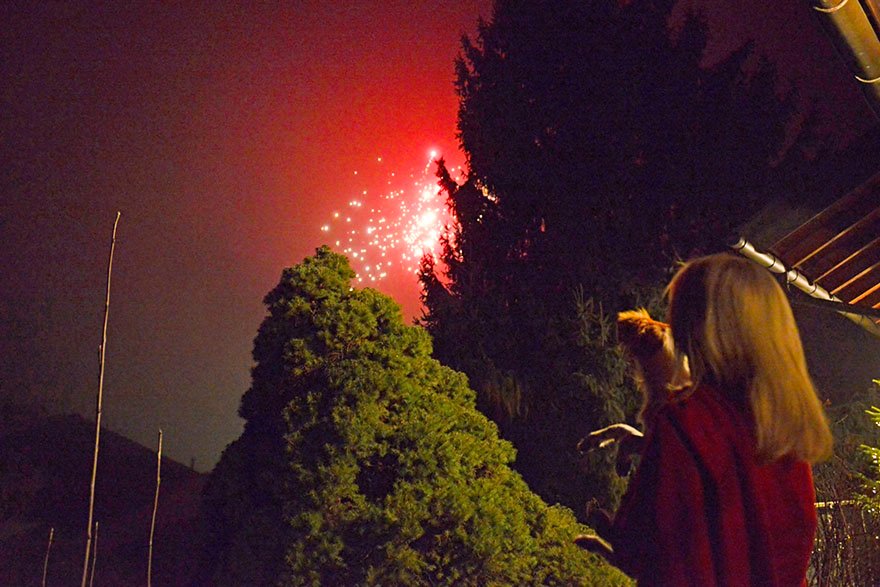 19Sylvester 2013 - Feuerwerk - ein neues Erlebnis für mich - in meinem Rudel fühle ich mich trotz des Lärms sicher und geborgen.